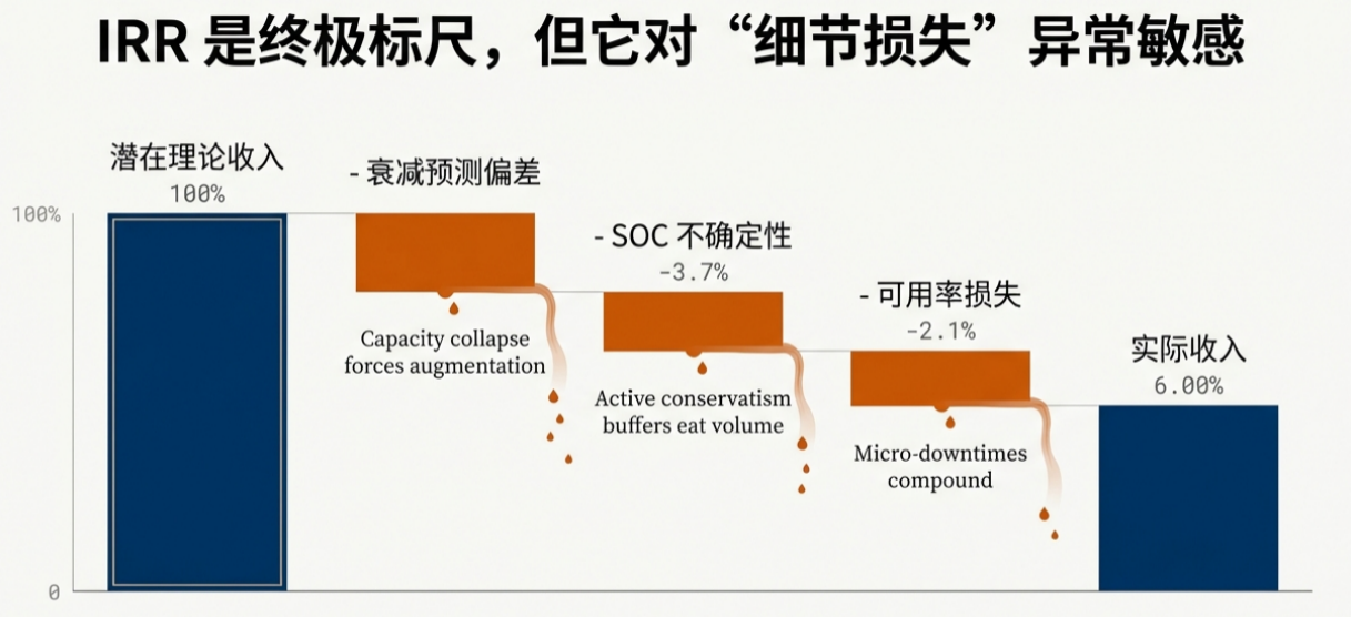 可用率少一兩個(gè)百分點(diǎn)、可調(diào)度能量少一兩個(gè)百分點(diǎn)、SOC誤差迫使你長期“留富余”少賣一兩個(gè)百分點(diǎn),都會(huì)在資產(chǎn)壽命里復(fù)利式放大,最終把“看起來并不大”的偏差,演化成融資端不可忽視的現(xiàn)金流斷崖。
