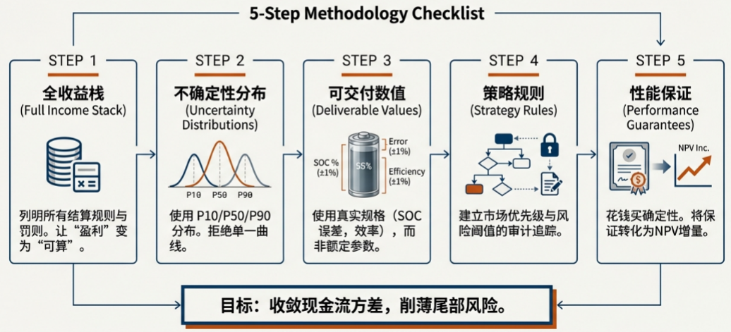把保證寫成‘買回 bp’:可用率、容量留存、可調(diào)度能量保證,折算成 IRR 基點(diǎn)增益與 NPV 增量,形成‘花錢買確定性’的定價(jià)語言。