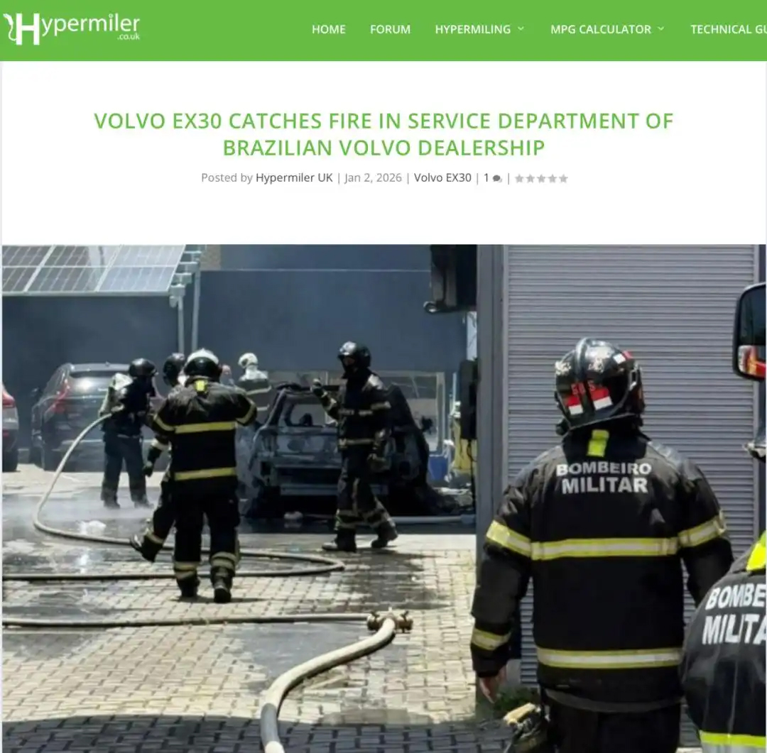 這場(chǎng)爭(zhēng)議的源頭還要追溯到2025年的11月份。公開報(bào)道顯示,去年11月,巴西一家沃爾沃經(jīng)銷商維修車間內(nèi),一輛沃爾沃EX30起火并被完全燒毀。事故未造成人員傷亡,但現(xiàn)場(chǎng)動(dòng)用了多輛消防車。