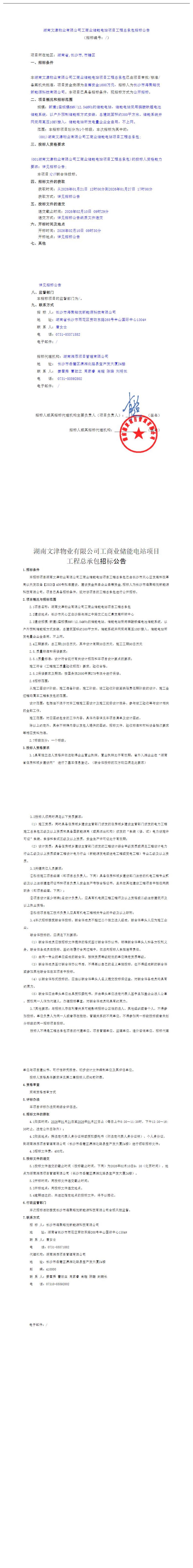 中國儲能網(wǎng)訊:1月21日,湖南文津物業(yè)有限公司工商業(yè)儲能電站項目工程總承包招標(biāo)公告發(fā)布。