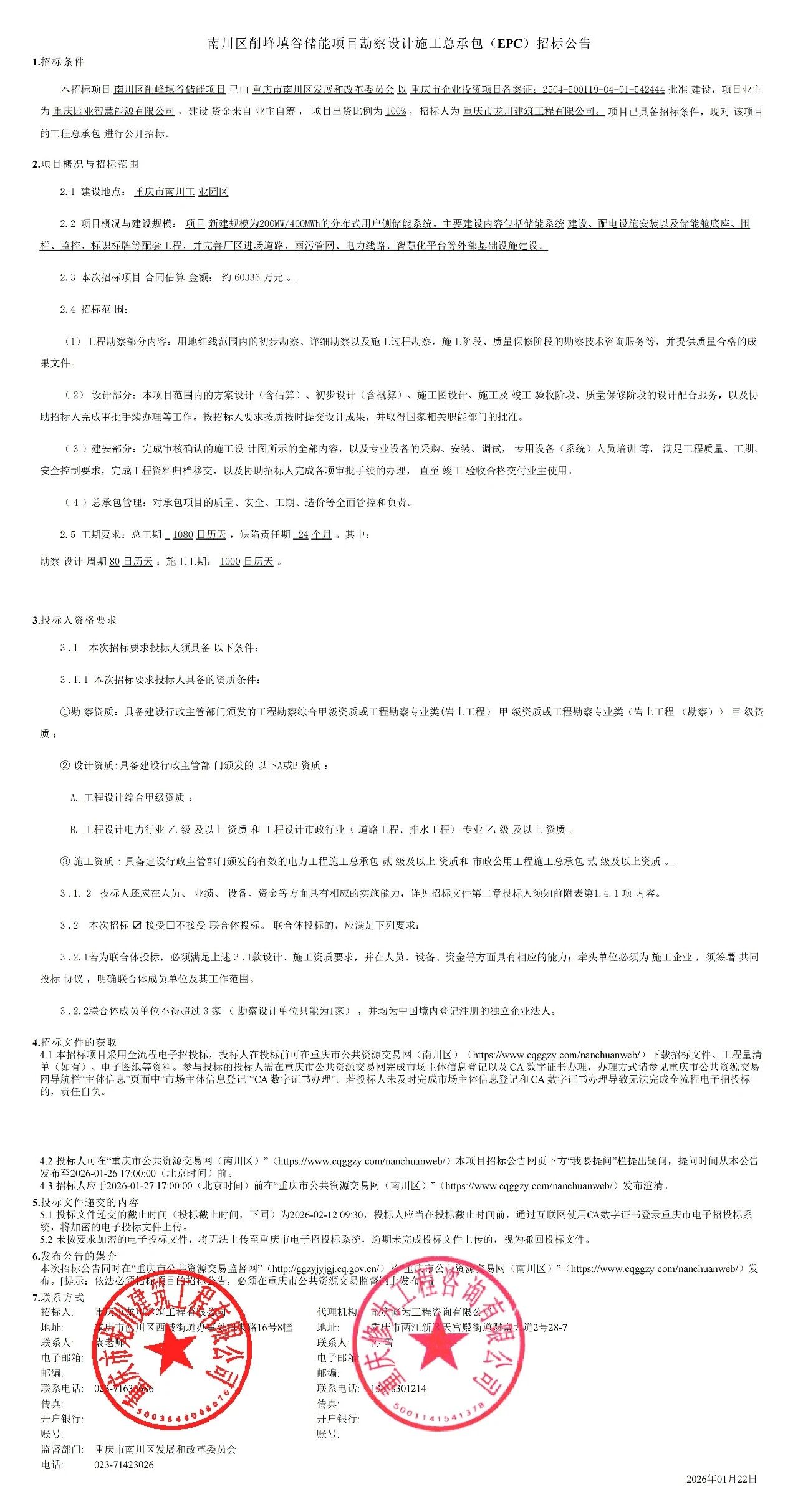 中國儲能網(wǎng)訊:1月22日,重慶南川區(qū)削峰填谷儲能項(xiàng)目勘察設(shè)計(jì)施工總承包(EPC)招標(biāo)公告。項(xiàng)目新建規(guī)模為200MW/400MWh的分布式用戶側(cè)儲能系統(tǒng)。項(xiàng)目合同估算金額約60336萬元,折合單價(jià)1.51元/Wh。