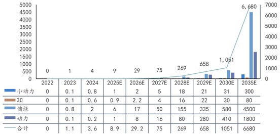 圖 2022~2035 年全球鈉離子電池市場(chǎng)規(guī)模及預(yù)測(cè)(GWh/年)