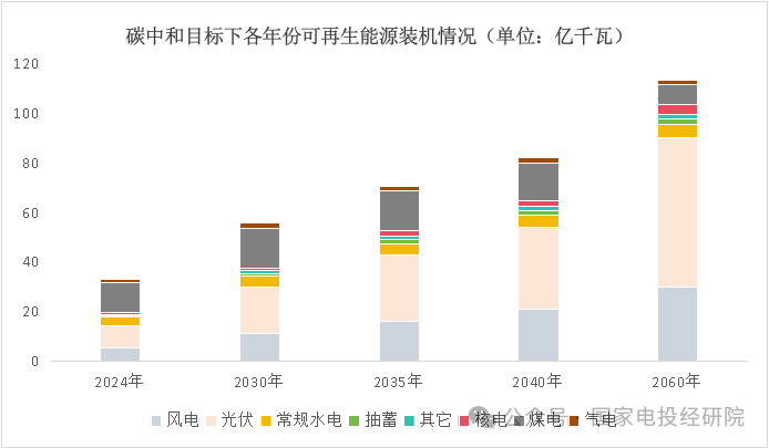 我國要實現(xiàn)碳中和目標,非化石能源消費占比到2060年將提高到八成以上,一次能源的非化石能源最主要的體現(xiàn)形式包括核能和可再生能源。各年度裝機結構初步預測結果如下表所示: