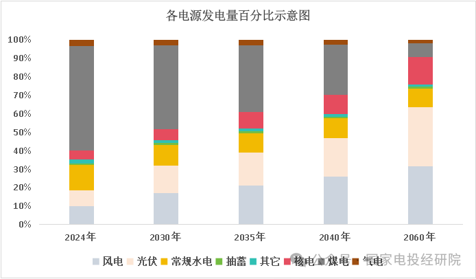 現(xiàn)階段我國新能源發(fā)展主要以風電、光伏為主。按照目前現(xiàn)有技術發(fā)展趨勢,風電、光伏將逐步成為新型電力系統(tǒng)的主體電源。預計到2060年,風電、光伏裝機分別達到30、60億千瓦,占全球裝機比例逐步由當前的47%降至30%左右,發(fā)電量合計12萬億千瓦時,占總發(fā)電量的63%左右。