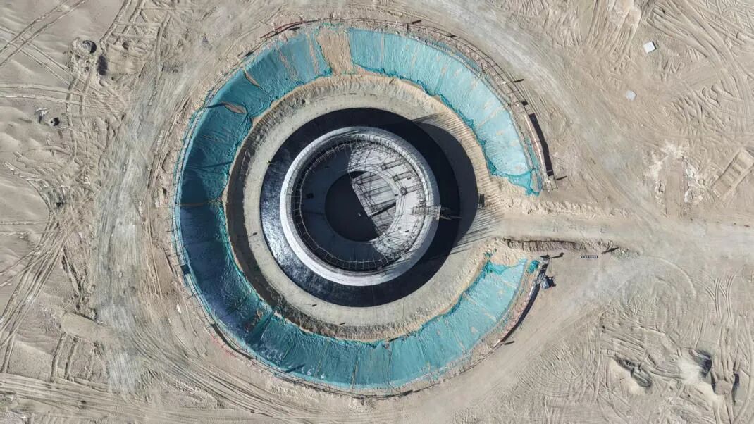 記者現(xiàn)場:光熱電站最標(biāo)志的建筑就是它200多米高的吸熱塔,我現(xiàn)在已經(jīng)來到了吸熱塔的施工現(xiàn)場,現(xiàn)在吸熱塔的一個大的底座已經(jīng)建設(shè)完成了,它最大的直徑可以達到36米長,所以在我面前是一個非常龐大的圓柱體,現(xiàn)場的工作人員正在對底座做防腐涂裝,所以我也能聞到涂料的味道,在涂裝結(jié)束之后,整個吸熱塔的堅固的底座就會被沙土掩埋。我們再用混凝土向上澆筑,一直澆筑200多米再安裝我們的吸熱器。