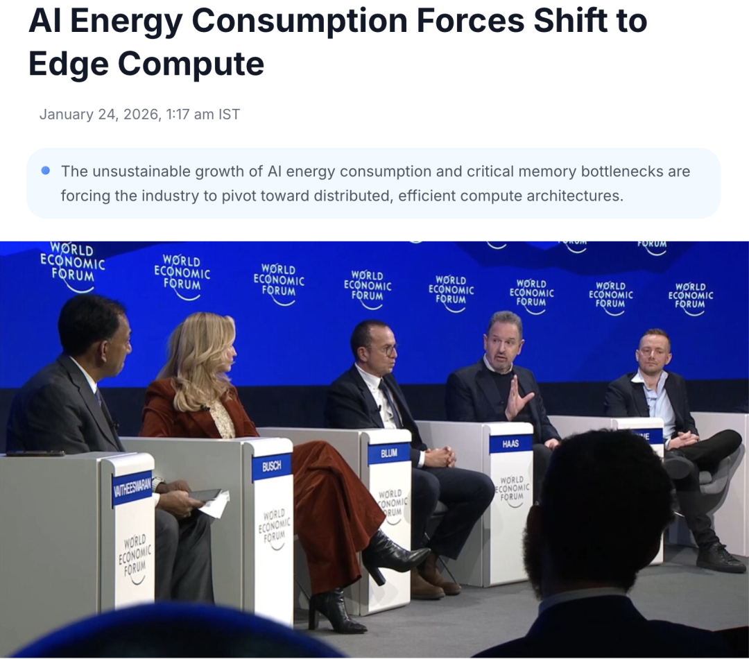 中國儲能網(wǎng)訊:2026年達沃斯世界經(jīng)濟論壇上,一個共識正在形成:人工智能的爆炸式增長正面臨現(xiàn)實瓶頸。Arm CEO Rene Haas在接受《金融時報》專訪時確認,行業(yè)正遭遇算力、內(nèi)存,尤其是AI能耗的臨界點,這迫使整個產(chǎn)業(yè)進行根本性的架構(gòu)轉(zhuǎn)型。這場變革的核心,是從集中式云計算向分布式邊緣計算的戰(zhàn)略轉(zhuǎn)移。