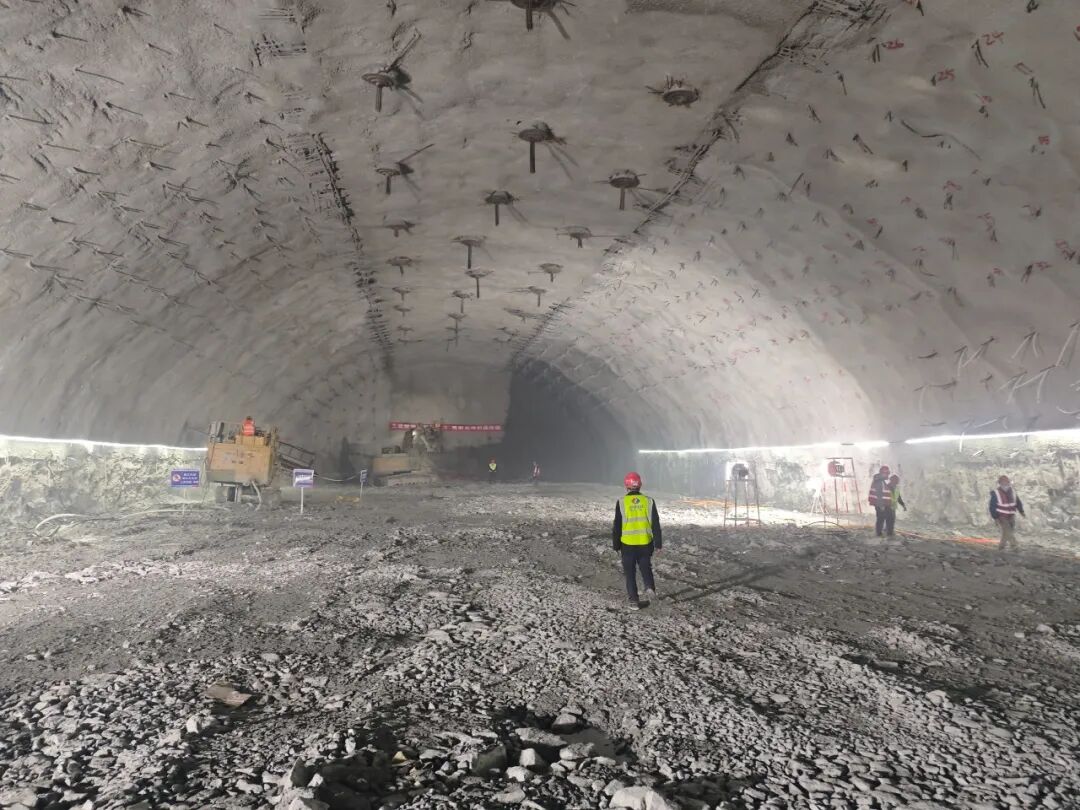 電站地下廠房施工區(qū)域地質(zhì)條件復(fù)雜,施工難度和安全風(fēng)險(xiǎn)較大。肅南公司團(tuán)結(jié)帶領(lǐng)各參建單位,迎難而上、聚力攻堅(jiān),堅(jiān)持“穩(wěn)扎穩(wěn)打、支護(hù)先行”原則,采用“中導(dǎo)洞先行、上下游邊墻分步擴(kuò)挖”的施工方法,綜合運(yùn)用超前地質(zhì)預(yù)報(bào)、微震監(jiān)測(cè)等信息化手段,實(shí)現(xiàn)智能化監(jiān)控與精準(zhǔn)施工,有效管控圍巖失穩(wěn)等施工風(fēng)險(xiǎn)。同時(shí)構(gòu)建“錨固洞+對(duì)穿錨索+系統(tǒng)錨桿+鋼筋拱肋+預(yù)應(yīng)力錨桿+掛網(wǎng)噴護(hù)”復(fù)合支護(hù)體系,實(shí)現(xiàn)圍巖表層穩(wěn)固與深層錨固的雙重防護(hù),全力保障地下廠房施工的安全與質(zhì)量。