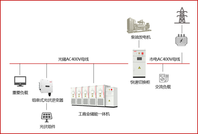 低壓一體化方案:適配小型工商業(yè)園區(qū),靈活集成光伏、儲能、充電與柴發(fā),提升供電可靠性。
