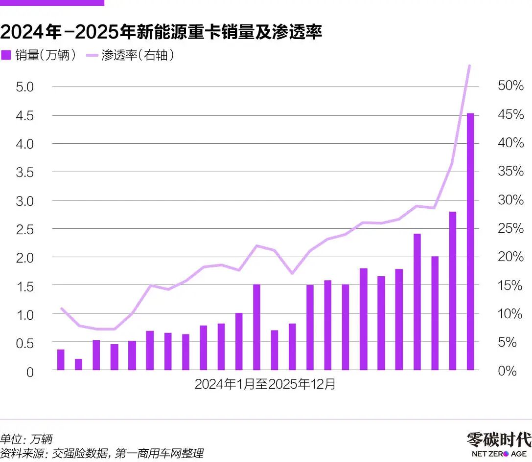 據(jù)第一商用車網(wǎng)統(tǒng)計的交強險數(shù)據(jù),2025年12月,中國售出了4.53萬輛新能源重卡,終端滲透率達到53.89%,其中純電動重卡4.08萬輛,占比48.6%,新能源重卡和純電動重卡的月度銷量和滲透率雙雙創(chuàng)下歷史新高。