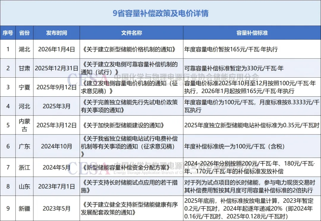 其中,在電網(wǎng)側新型儲能方面,我國正處于從地方探索多樣化“容量補償”向全國范圍建立統(tǒng)一、規(guī)范的“容量電價”機制過渡的關鍵階段。截至目前,全國已經(jīng)有包括湖北、甘肅、寧夏等9省公布了電網(wǎng)側獨立儲能容量補償政策及價格標準。