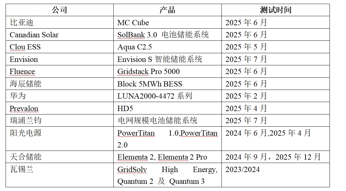 下表為已公布或報道進行過大規(guī)模防火測試(LSFT)的電池儲能系統制造商與集成商。該清單并不完整,隨著大規(guī)模防火測試(LSFT)成為強制性要求,預計 2026 年將有更多廠商完成測試。