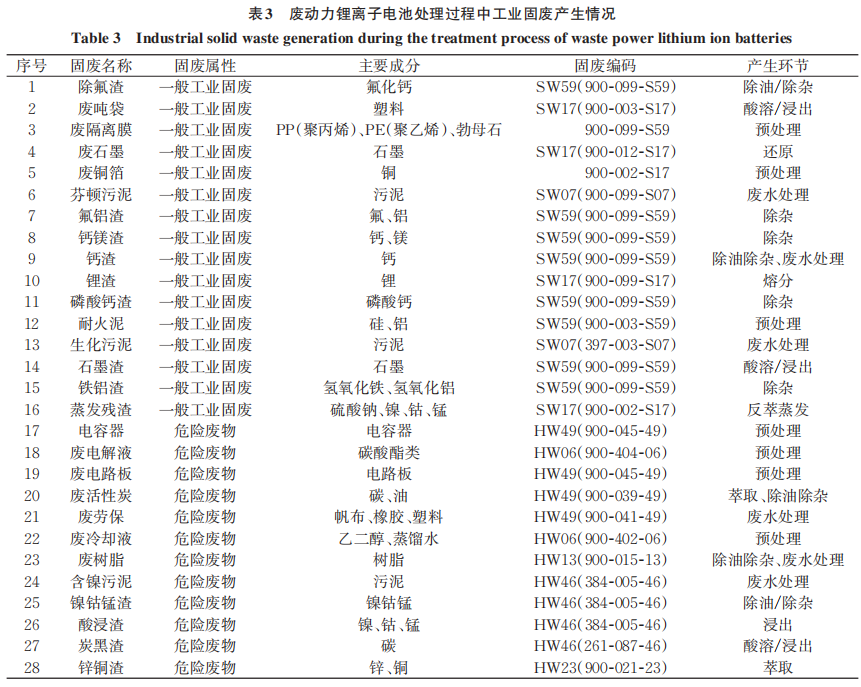 本文梳理了不同來源的動力鋰離子電池回收過程中產(chǎn)生的廢水情況,分析不同工序階段產(chǎn)生的廢氣情況,不同回收工藝產(chǎn)生的工業(yè)固廢情況。