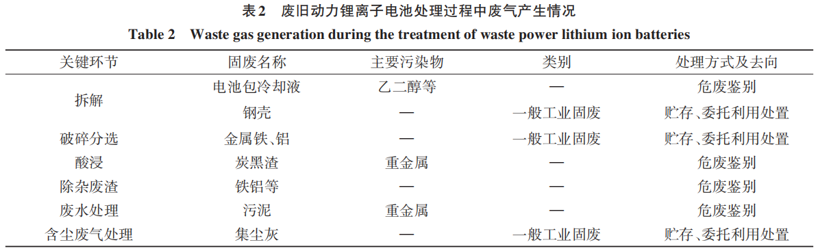 廢舊動力鋰離子電池的回收工藝涉及多個階段,每個階段均可能產(chǎn)生不同類型的廢氣,如表2所示。