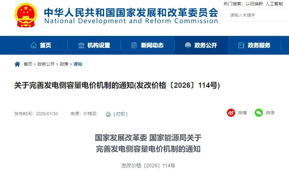 中國儲能網(wǎng)訊:1月30日,儲能行業(yè)迎來里程碑式政策突破!國家發(fā)改委、國家能源局聯(lián)合發(fā)布了《關于完善發(fā)電側(cè)容量電價機制的通知》(發(fā)改價格〔2026〕114號)(以下簡稱“114號文”),引發(fā)電力行業(yè)廣泛關注。