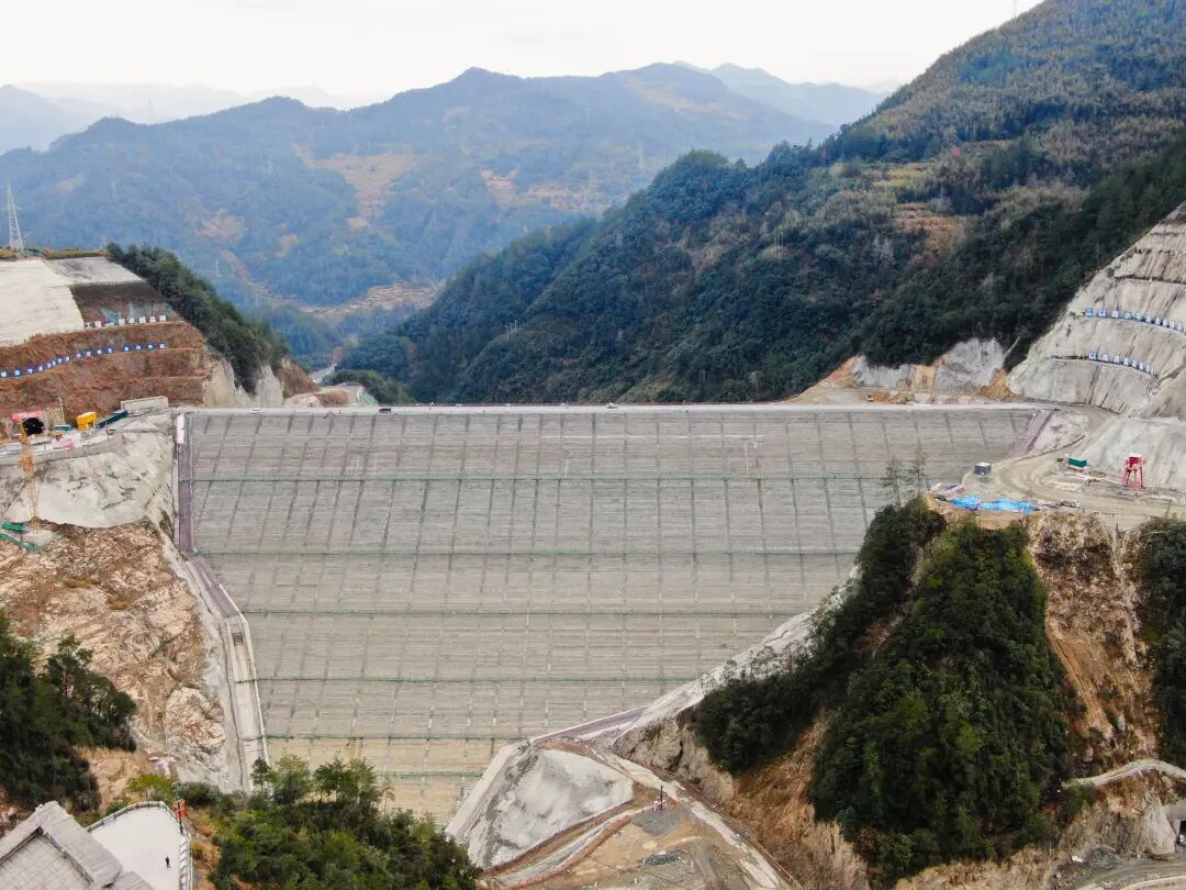 電站位于浙江省麗水市景寧畬族自治縣,是國家“十四五”能源發(fā)展規(guī)劃重點工程、浙江省“十四五”可再生能源發(fā)展重點項目。總裝機容量1400兆瓦,安裝4臺350兆瓦可逆式水輪發(fā)電機組,設計年發(fā)電量14億千瓦時,建成后將承擔浙江電網(wǎng)調(diào)峰、填谷、調(diào)頻、調(diào)相及緊急事故備用等重要任務。本次完成填筑的下水庫大壩為鋼筋混凝土面板堆石壩,壩頂高程391.00米,最大壩高122米,壩頂長326.60米,壩頂寬度10.0米,填筑方量295.7萬方。
