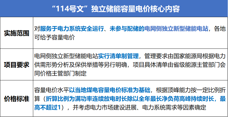 拆解政策原文來看,114號文主要從實(shí)施范圍、項(xiàng)目要求、價(jià)格標(biāo)準(zhǔn)三個(gè)方面明確了獨(dú)立儲能容量電價(jià)的基本原則。