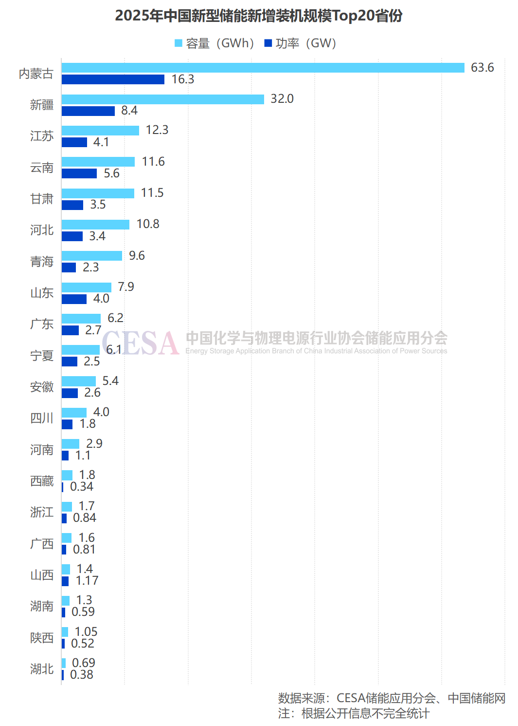 據(jù)CESA儲能應(yīng)用分會產(chǎn)業(yè)數(shù)據(jù)庫不完全統(tǒng)計(jì),2025年,內(nèi)蒙古新增裝機(jī)16.3GW/63.6GWh,占2025年全國新增裝機(jī)的25.2%(功率)/32.4%(容量),功率和容量規(guī)模均居全國第一。