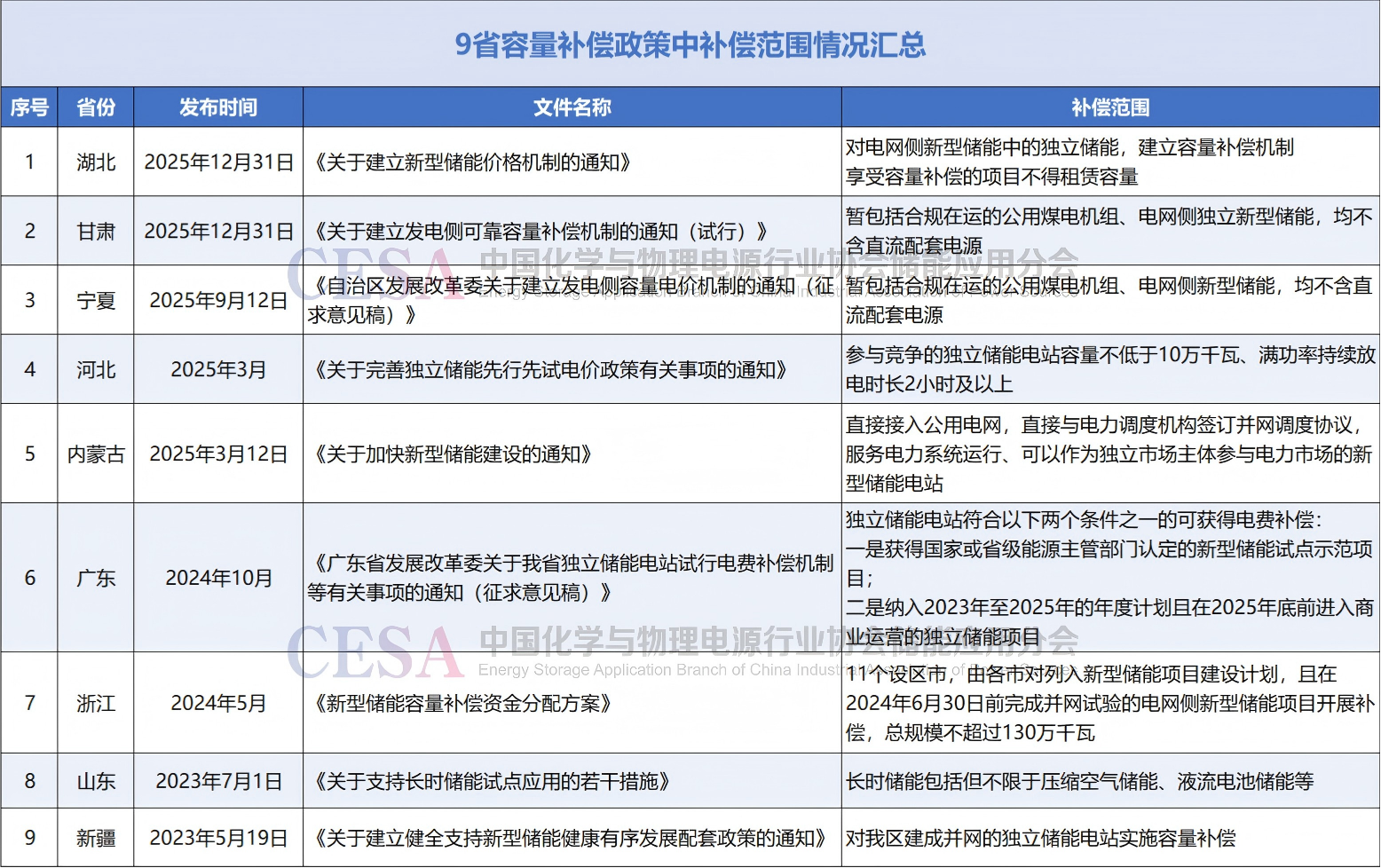 其中,寧夏和甘肅在政策中共同提到,“補(bǔ)償范圍暫包括合規(guī)在運(yùn)的公用煤電機(jī)組、電網(wǎng)側(cè)獨(dú)立新型儲能,均不含直流配套電源”;內(nèi)蒙古的文件中提到,“直接接入公用電網(wǎng),直接與電力調(diào)度機(jī)構(gòu)簽訂并網(wǎng)調(diào)度協(xié)議,服務(wù)電力系統(tǒng)運(yùn)行、可以作為獨(dú)立市場主體參與電力市場的新型儲能電站”。