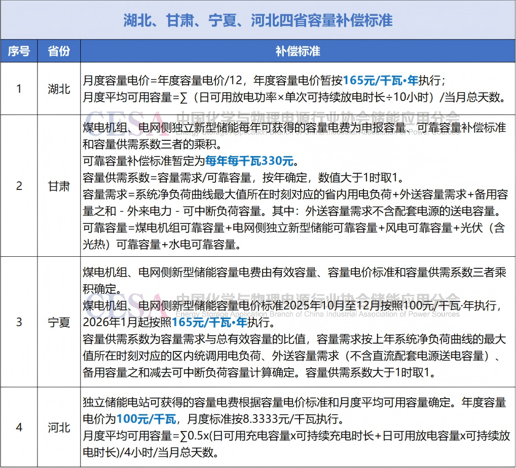 除湖北、甘肅、寧夏、河北之外,其余5省的容量補(bǔ)償標(biāo)準(zhǔn)均未涉及相關(guān)系數(shù)及計(jì)算公式,補(bǔ)償方式和標(biāo)準(zhǔn)也各不相同。