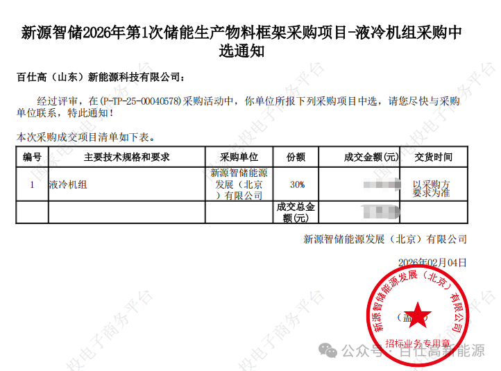 中國(guó)儲(chǔ)能網(wǎng)訊:近日,百仕高(山東)新能源科技有限公司憑借穩(wěn)定的產(chǎn)品品質(zhì)、成熟的技術(shù)方案與高效的服務(wù)響應(yīng),在新源智儲(chǔ)能源發(fā)展(北京)有限公司 2026 年第 1 次儲(chǔ)能生產(chǎn)物料框架采購(gòu)項(xiàng)目(采購(gòu)編號(hào):P-TP-25-00040578)中成功中標(biāo),斬獲30%采購(gòu)份額!此次合作,標(biāo)志著雙方合作互信持續(xù)深化,也彰顯了百仕高公司在儲(chǔ)能核心部件領(lǐng)域的穩(wěn)固競(jìng)爭(zhēng)力。