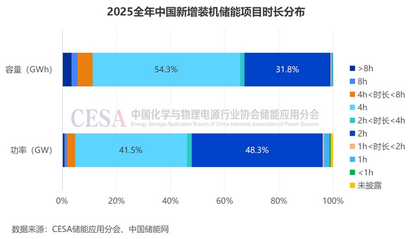 據(jù)CESA儲(chǔ)能應(yīng)用分會(huì)產(chǎn)業(yè)數(shù)據(jù)庫不完全統(tǒng)計(jì),2025全年新型儲(chǔ)能新增裝機(jī)項(xiàng)目中,4h儲(chǔ)能項(xiàng)目新增裝機(jī)26.7GW/106.8GWh,占比高達(dá)41.3%(功率)/54.3%(容量)。