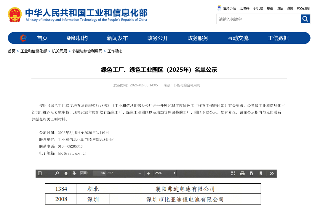 中國(guó)儲(chǔ)能網(wǎng)訊:2026年2月5日,國(guó)家工業(yè)和信息化部正式公布“綠色工廠、綠色工業(yè)園區(qū)(2025年)”名單,深圳市比亞迪鋰電池有限公司、襄陽(yáng)弗迪電池有限公司成功獲評(píng)2025年國(guó)家級(jí)綠色工廠。
