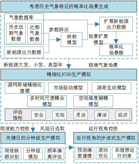 ②生產(chǎn)模擬工具邏輯完善與功能擴(kuò)展。引入氣象和市場(chǎng)等新要素,為供需平衡提供概率化邊界;構(gòu)建分鐘級(jí)生產(chǎn)模擬模型,刻畫系統(tǒng)運(yùn)行全環(huán)節(jié),評(píng)估多時(shí)間尺度調(diào)節(jié)缺口。