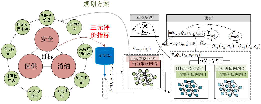 ③考慮“三元邊界”的智能規(guī)劃工具構(gòu)建與應(yīng)用。統(tǒng)籌安全、保供、消納三元邊界,構(gòu)建深度強(qiáng)化學(xué)習(xí)框架,在新型電力系統(tǒng)規(guī)劃中補(bǔ)強(qiáng)穩(wěn)定、平衡、調(diào)節(jié)要素。