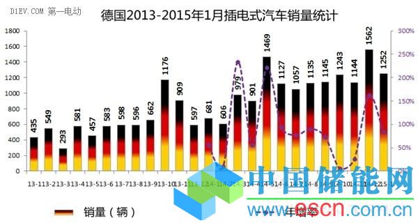2015年伊始,插電式汽車在德國再續(xù)2014年末的強(qiáng)勁熱銷風(fēng),1月份新注冊1252輛,同比大增84%,市場占比也創(chuàng)出0.6%的歷史新高。