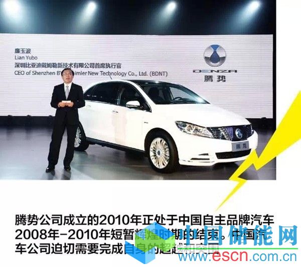 與王傳福之前的座駕、比亞迪旗下的混合動(dòng)力車“秦”不同,騰勢并非由比亞迪獨(dú)立研發(fā)。2010年,比亞迪與德國戴姆勒集團(tuán)共同出資6億元人民幣,按50:50股比成立深圳比亞迪戴姆勒新技術(shù)有限公司(簡稱BDNT)。騰勢是其推出的首個(gè)新能源汽車品牌。