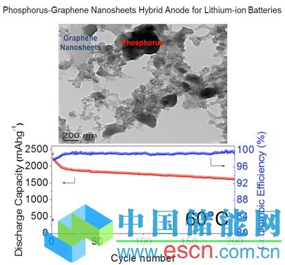 針對這一問題,最近美國賓夕法尼亞州立大學(xué)(The Pennsylvania State University)王東海教授領(lǐng)導(dǎo)的,以于昭新、宋江選為主的科研梯隊發(fā)明了一種新型鋰離子電池負極材料:“紅磷-石墨烯”納米復(fù)合材料。該種材料是由紅磷和石墨經(jīng)球磨制備得到。紅磷化學(xué)穩(wěn)定性高,廉價易得,而且環(huán)境友好。其作為鋰離子電池負極材料的理論容量可達2600 mAh/g,7倍于商用石墨電極。 石墨/石墨烯因其極高的電子電導(dǎo)率被引入到該體系中以提升納米復(fù)合材料整體的電子電導(dǎo)率。在高速球磨過程中,微米級的紅磷顆粒被打碎至納米級。石墨在球磨 過程中剝離為大比表面積的石墨烯。經(jīng)過長時間機械力作用,石墨烯相互搭接形成一個緊密結(jié)合的三維導(dǎo)電網(wǎng)絡(luò),而納米級紅磷顆粒均勻分散在該網(wǎng)絡(luò)中。紅外光譜 (Infrared Spectroscopy)測試顯示,紅磷和石墨烯以“磷-氧-碳 (P-O-C)”的化學(xué)鍵形式結(jié)合在一起,這又為該材料出眾的電池性能提供了保證。在室溫下,該納米復(fù)合材料的放電容量可達1400mAh/g, 4倍于現(xiàn)行商用化鋰離子電池負極材料–石墨。 經(jīng)過300周的循環(huán),放電容量仍然能保持在60%以上。高溫環(huán)境(60°C)對于現(xiàn)行商用鋰離子電池仍是很大的挑戰(zhàn)。而該種材料,在60°C下,放電容量 可進一步提升至1650mAh/g。經(jīng)過200周循環(huán),放電容量保持率可在70%以上。