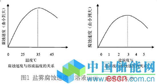 影響鹽霧主要因素包括:溫度、相對(duì)濕度、鹽溶液的濃度、鹽溶液的pH值、鹽霧沉降量等,其中溫度和相對(duì)濕度、濃度是直接影響鹽霧對(duì)金屬的腐蝕因素。金屬腐蝕的臨界相對(duì)濕度大約為70%。當(dāng)相對(duì)濕度達(dá)到或超過(guò)這個(gè)臨界濕度時(shí),腐蝕速度相應(yīng)加速。南海的年平均相對(duì)濕度是85%,自然腐蝕速度加速。鹽霧的腐蝕作用受到溫度及鹽霧濃度的影響,這種影響狀況見(jiàn)圖1。
