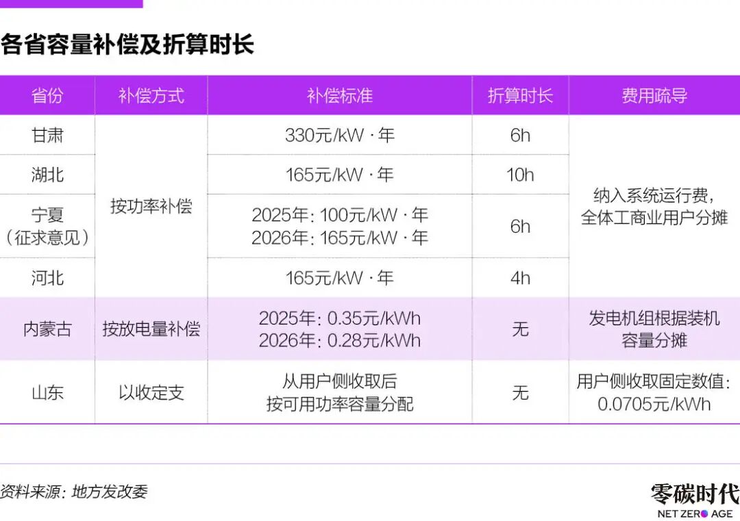 甘肅省在2025年底出臺的容量電價試行機(jī)制中首次明確“系統(tǒng)凈負(fù)荷高峰持續(xù)時長暫定為6小時”,其余省份雖然沒有明確提出,但是曾將類似概念的折算比例定在10小時、6小時或4小時,可以作為參照系數(shù)。這表明,目前占據(jù)市場規(guī)模半數(shù)以上的2小時級儲能在容量電價折算標(biāo)準(zhǔn)前將大打折扣,4小時以上的長時儲能得到的容量補(bǔ)償將比之翻倍甚至更多。