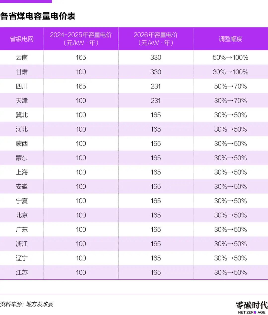 截至2月5日,全國已有16個省級電網(wǎng)公布了2026年煤電容量電價,云南、甘肅將煤電容量電價一次性頂格調(diào)整到330元/kW·年,四川、天津?qū)⒚弘娙萘侩妰r調(diào)整到231元/kW·年,其余省份調(diào)整到165元/kW·年。