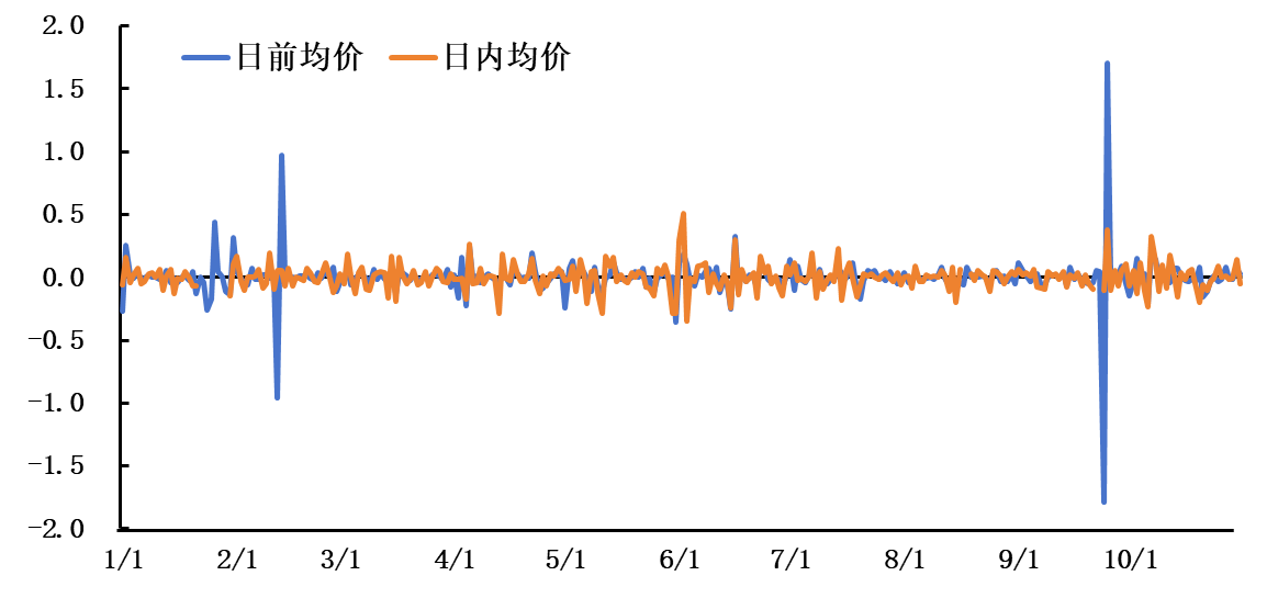 國際成熟市場經(jīng)驗表明,日前現(xiàn)貨價格由于具備良好的時間連續(xù)性、市場代表性及預測穩(wěn)定性,常被作為電力期貨合約的首選定價基準。為檢驗該基準在我國新興電力市場環(huán)境中的適用性,本節(jié)基于2025年1月至10月廣東電力現(xiàn)貨市場的實際運行數(shù)據(jù),對日前均價與日內(nèi)均價進行系統(tǒng)的統(tǒng)計對比與相關(guān)性分析,旨在為我國電力期貨合約的基準選擇提供實證依據(jù)。