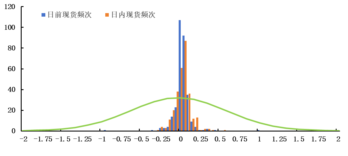 進一步分析現(xiàn)貨市場的價格波動特征,可以觀察EEX現(xiàn)貨價格的對數(shù)收益率時序及其頻次分布,其中,對數(shù)收益率定義為In(本日價格/前一日價格),是金融分析中衡量資產(chǎn)價格相對變動的常用指標??梢园l(fā)現(xiàn),絕大多數(shù)時段內(nèi)EEX現(xiàn)貨收益率波動幅度有限,但在12月18日的價格尖峰日,也相應(yīng)的形成了顯著的“脈沖”式異常值。盡管多數(shù)時間內(nèi)價格變化幅度有限,但其對數(shù)收益率分布呈現(xiàn)出典型的“厚尾”形態(tài),即極端收益率出現(xiàn)的頻率顯著高于正態(tài)分布的預期。這說明電力現(xiàn)貨市場雖多數(shù)時間波動有限,但發(fā)生極端行情的概率高于傳統(tǒng)金融資產(chǎn),尾部風險更為突出。