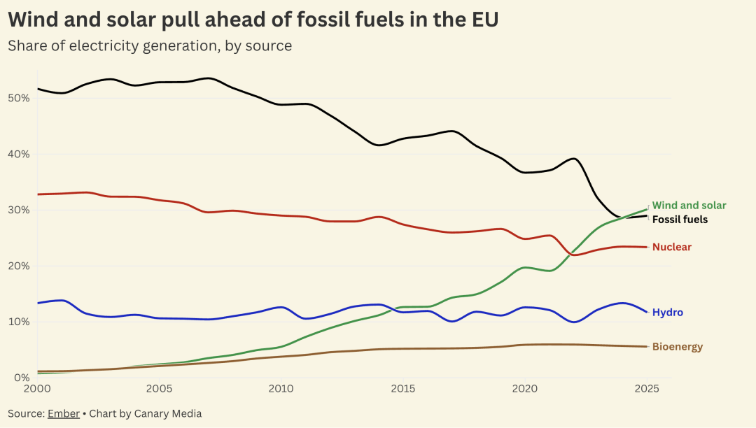 中國(guó)儲(chǔ)能網(wǎng)訊:二十年前,歐盟的電力供應(yīng)還幾乎與風(fēng)電、光伏絕緣。如今,這兩種清潔能源已經(jīng)成了歐盟電力體系的主力軍。據(jù)能源研究機(jī)構(gòu)恩伯發(fā)布的最新報(bào)告,2025年歐盟風(fēng)電和光伏的全年發(fā)電量,首次超過(guò)了化石燃料發(fā)電量。這是歐盟能源轉(zhuǎn)型進(jìn)程中的一個(gè)里程碑。