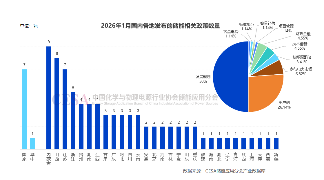據(jù)CESA儲能應用分會產(chǎn)業(yè)數(shù)據(jù)庫不完全統(tǒng)計,2026年1月份共發(fā)布儲能相關(guān)政策88項,國家層面發(fā)布7項,涉及容量電價、微電網(wǎng)、財政金融、標準規(guī)范等多個方面。