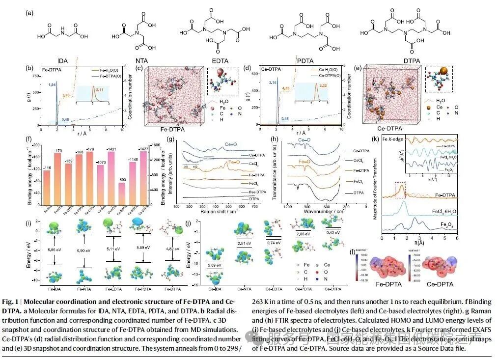液流電池具備本質(zhì)安全屬性、高可靠性等顯著技術(shù)優(yōu)勢(shì),是最具競(jìng)爭(zhēng)力的長(zhǎng)時(shí)電化學(xué)儲(chǔ)能技術(shù)之一。本研究通過配體設(shè)計(jì)結(jié)合分子動(dòng)力學(xué)模擬,精準(zhǔn)實(shí)現(xiàn)液流電池電解質(zhì)絡(luò)合結(jié)構(gòu)的穩(wěn)定調(diào)控,并借助同步輻射X射線吸收光譜明晰了活性物質(zhì)的局部配位環(huán)境。該技術(shù)成果不僅顯著降低配體穿梭與滲透壓差引發(fā)的水遷移問題,同時(shí)賦予電解質(zhì)寬pH適應(yīng)性與高效可逆的電子轉(zhuǎn)移特性,能夠有效助力液流電池降低自放電率、提升系統(tǒng)能量效率并降低產(chǎn)業(yè)化成本。