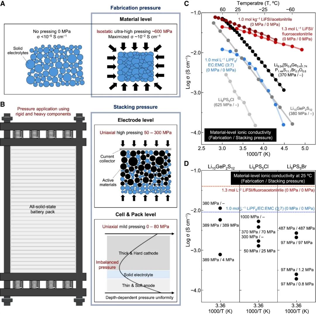 圖2. 固態(tài)電解質(zhì)的實(shí)際壓力限制以及材料層面與電池層面性能之間的差異