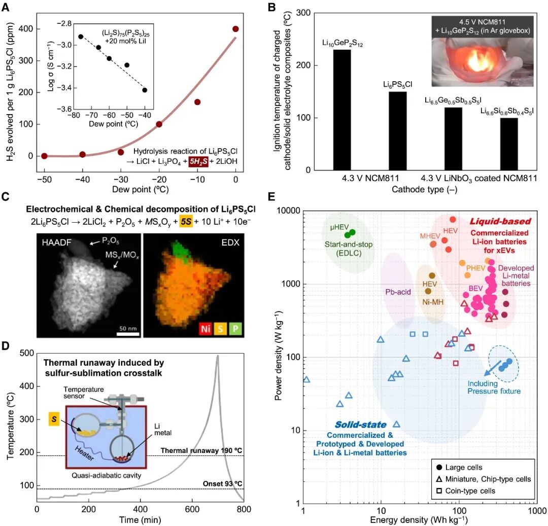 研究通過(guò)實(shí)驗(yàn)證明,硫化物固態(tài)電解質(zhì)遇濕氣會(huì)釋放劇毒H2S氣體(≥1000 ppm可致命),且其與富鎳正極材料(如NCM811)接觸后,在100°C以下即可引發(fā)自燃。此外,固態(tài)體系中鋰枝晶更易沿晶界生長(zhǎng),觸發(fā)短路和熱失控。對(duì)比液態(tài)電池(可通過(guò)隔膜與界面自修復(fù)抑制枝晶),固態(tài)系統(tǒng)的安全優(yōu)勢(shì)被過(guò)度夸大。圖中Ragone曲線進(jìn)一步顯示,目前全固態(tài)電池的實(shí)際能量/功率密度均落后于液態(tài)體系,且數(shù)據(jù)多來(lái)自微尺度電芯,難以反映大尺寸性能。