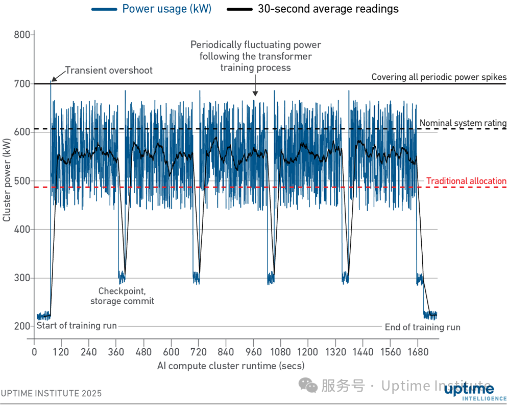根據(jù) Uptime Intelligence 的分析,在最極端情況下,AI訓(xùn)練過程中系統(tǒng)級功率的低點與高點差值可能超過100%,也就是說,功率幾乎在毫秒級內(nèi)完成“翻倍”。這種情況每隔幾秒就會反復(fù)出現(xiàn),通常發(fā)生在 GPU 從短暫低負載狀態(tài)迅速進入高強度計算階段時。