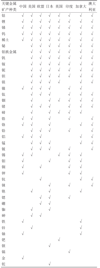 表1 主要國家和地區(qū)的關鍵金屬礦產清單對比