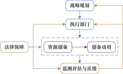 我國關鍵金屬礦產品儲備體系以保障國家資源安全為核心,從頂層戰(zhàn)略設計出發(fā),在戰(zhàn)略規(guī)劃、資源儲備與政策調整等方面逐步完善。目前通過國家儲備戰(zhàn)略規(guī)劃機制,形成了統(tǒng)籌實物、權益及替代性關鍵金屬礦產品的多元儲備;在《中華人民共和國礦產資源法》等法治框架下,形成了穩(wěn)定的動用程序;通過多部門協(xié)調聯(lián)動的宏觀管理架構,依托現(xiàn)代化庫存管理與質量監(jiān)測體系,確保了儲備的可用性,確立了收儲、輪換、動用的調整機制,并不斷反饋優(yōu)化儲備規(guī)模和動用節(jié)奏,為提升產業(yè)鏈韌性、應對國際市場波動及突發(fā)供給風險提供了堅實的戰(zhàn)略保障。我國關鍵金屬礦產品儲備體系框架如圖1所示。