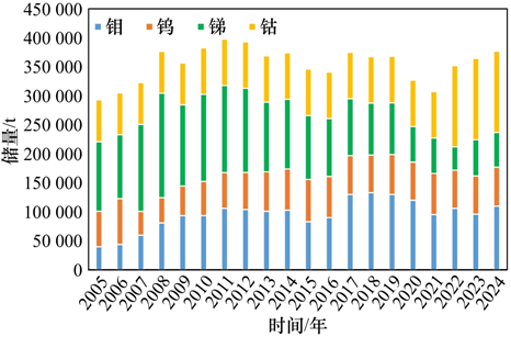 圖2 2005—2024年我國的鉬、鎢、銻、鈷礦儲量