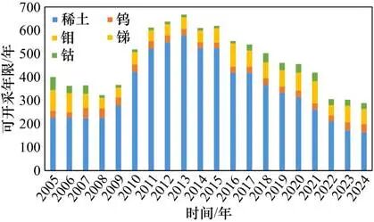 圖3 2005—2024年我國稀土、鎢、鉬、銻、鈷礦可開采年限