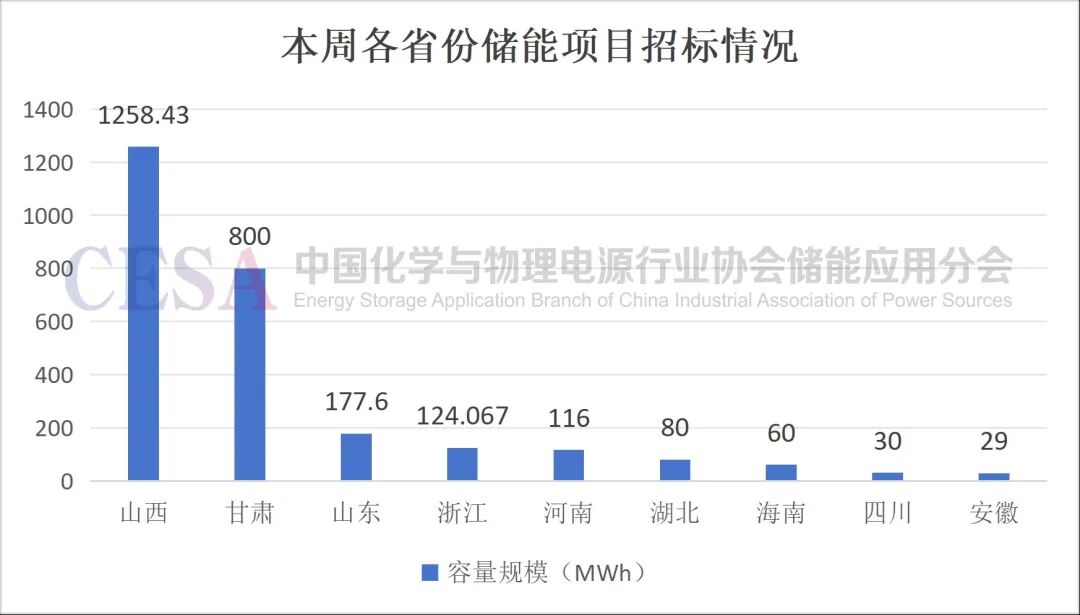 從各省份招標(biāo)項(xiàng)目的容量規(guī)???,山西省最多,容量規(guī)模共計(jì)1.28GWh;第二為甘肅,容量規(guī)模800 MWh;第三為山東,容量規(guī)模177.6MWh。