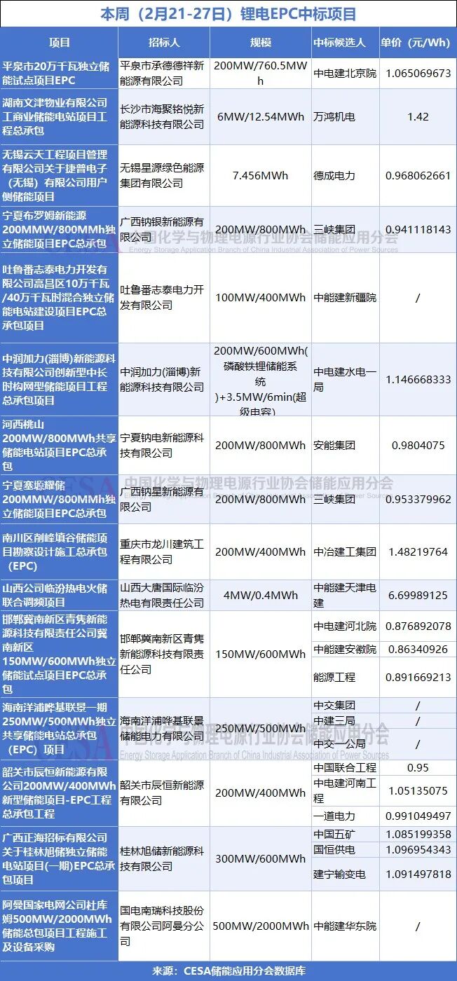 據(jù)CESA儲(chǔ)能應(yīng)用分會(huì)產(chǎn)業(yè)數(shù)據(jù)庫(kù)不完全統(tǒng)計(jì),本周(2月21-27日),共有32個(gè),共計(jì)1.16GW/2.73GWh儲(chǔ)能項(xiàng)目開啟招標(biāo),招標(biāo)范圍涉及電池、系統(tǒng)、EPC、容量租賃、運(yùn)維、PCS、液流電池等。