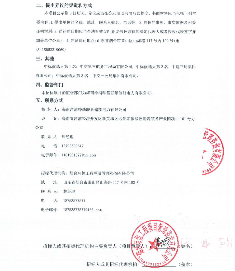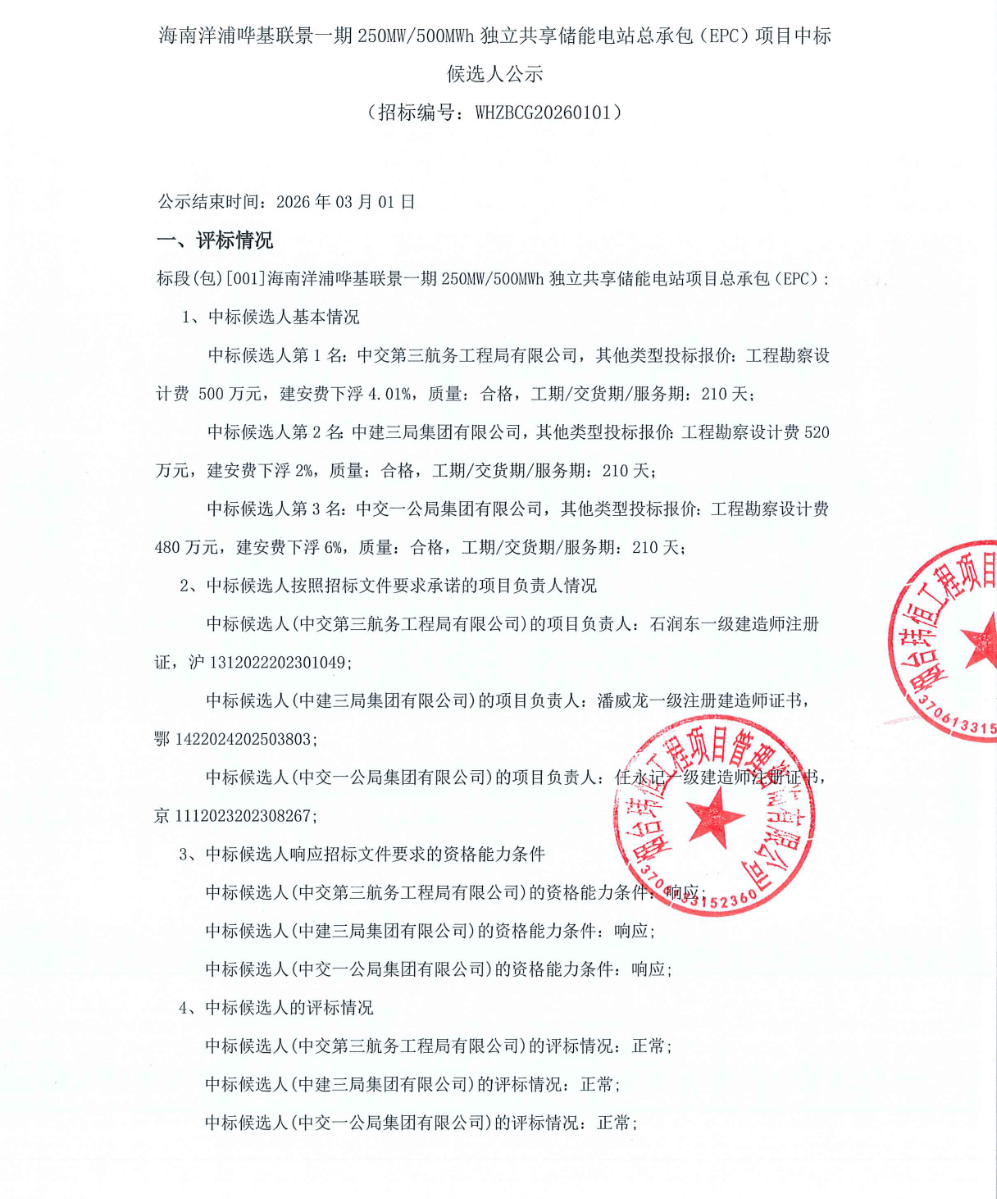 中國儲能網(wǎng)訊:2月26日,海南洋浦嘩基聯(lián)景一期250MW/500MWh獨立共享儲能電站總承包(EPC)項目中標候選人公示。根據(jù)公示,中交第三航務工程局有限公司預中標。