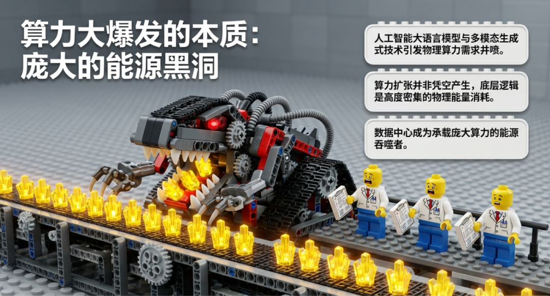 這種高并發(fā)、大參數(shù)模型的訓(xùn)練與推理過程,直接引發(fā)了對底層物理算力基礎(chǔ)設(shè)施井噴式的需求。算力的高速擴張并非憑空產(chǎn)生,其本質(zhì)是高度密集的物理能量消耗。數(shù)據(jù)中心作為承載龐大算力的物理實體,從工程熱力學(xué)與宏觀經(jīng)濟學(xué)的雙重視角來看,是一個極其龐大的“能源黑洞”。